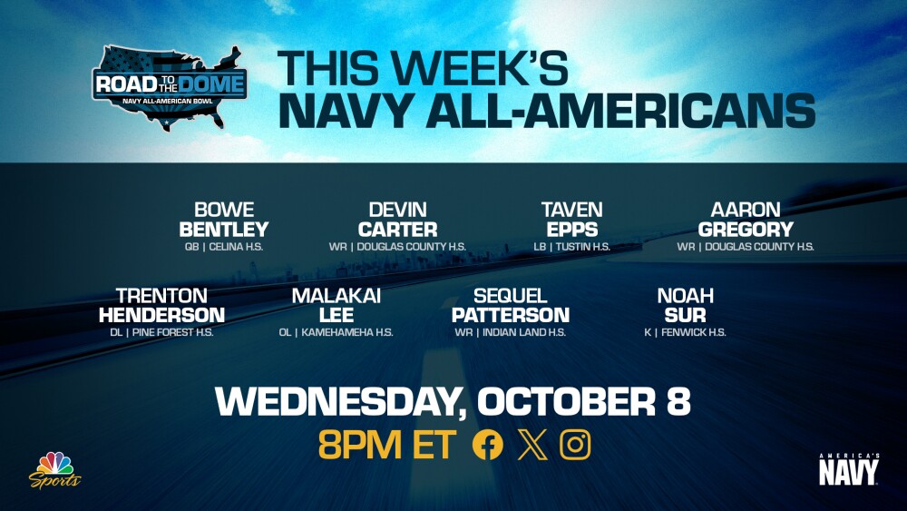 The 2026 Navy All-American Bowl will continue the Road to the Dome tour on Wednesday, October 8th at 8 p.m.